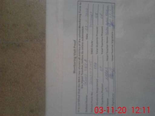 | School Visited by School Health & Nutrition Supervisor (No. of Visits) | 1 | Name1: | KASHIF BASHIR | Name2: | NIL |