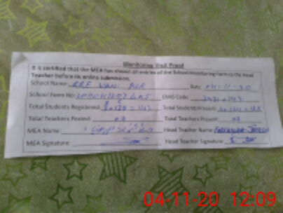 | Attendance Register | Head Teacher | MEA with School | Visit Proof |
