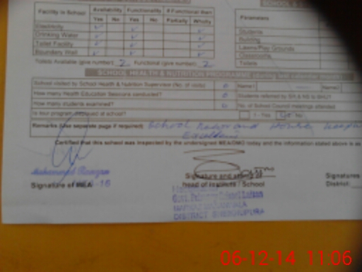 | Remarks (Use Separate Page if Required): School record cleaning and house keeping is excellent | |||||