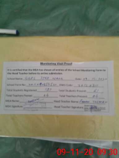 | Remarks (Use Separate Page if Required): 1 student attendance list in tab for verification class 2nd of previous session being shown in tab data required to be updated please promoted to 3rd class 2 ECE class being conducted out side in open air 3 amount of class room Rs 410 983 also retransferred to this school on 2nd September 20 in Nsb account 4 school health and nutrition supervisor not visited this school since long | |||||