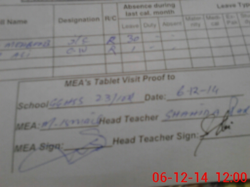 | Attendance Register | Head Teacher | MEA with School | Visit Proof |