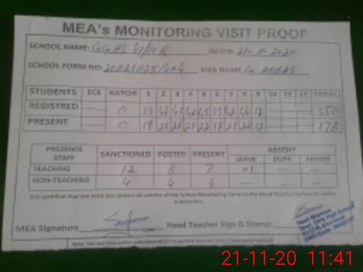 | Attendance Register | Head Teacher | MEA with School | Visit Proof |