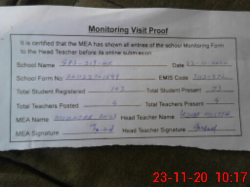 | Attendance Register | Head Teacher | MEA with School | Visit Proof |