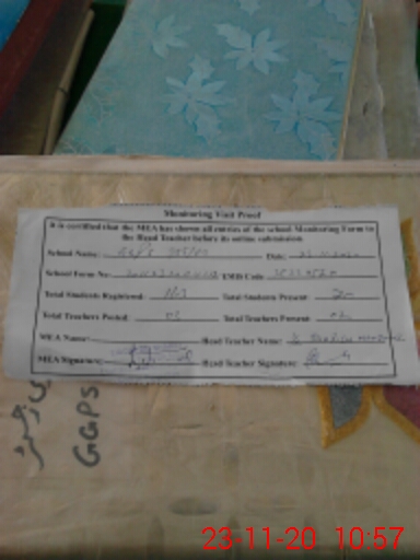 | Attendance Register | Head Teacher | MEA with School | Visit Proof |