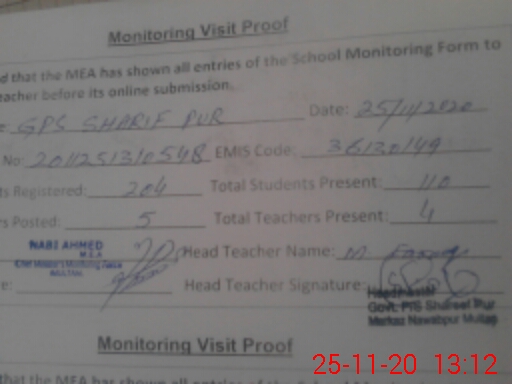 | EMIS Code: 36130149 | Name of School: GPS SHARIF PUR NAWAB PUR MULTAN | |||