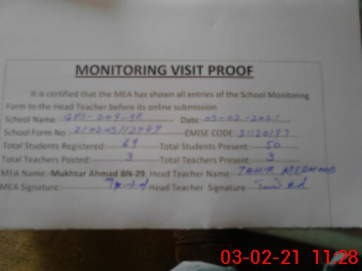 | EMIS Code: 31130197 | Name of School: GPS CHAK NO. 209/9-R SHARQI | |||