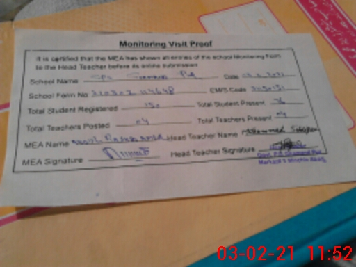 | Attendance Register | Head Teacher | MEA with School | Visit Proof |