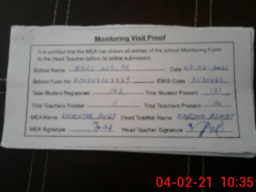 | Attendance Register | Head Teacher | MEA with School | Visit Proof |