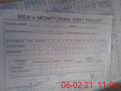 | Attendance Register | Head Teacher | MEA with School | Visit Proof |