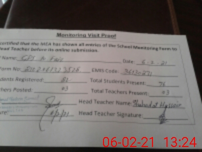 | Attendance Register | Head Teacher | MEA with School | Visit Proof |