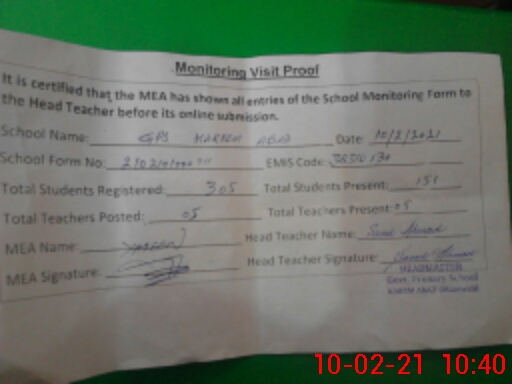 | Certified that this School was Inspected by the Undersigned MEA/DMO Today and the Information Stated Above is as Per Record. | |||||