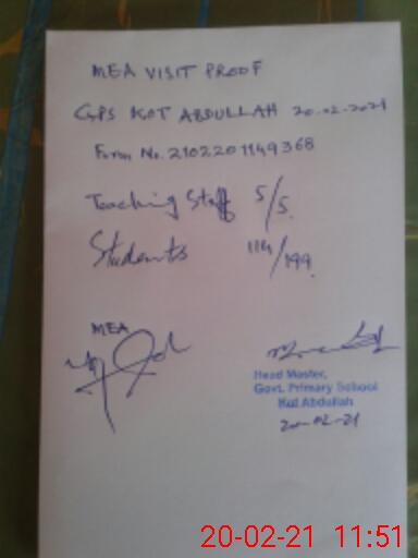 | EMIS Code: 36420217 | Name of School: GPS KOT ABDULLAH, P/O MAKHDOOM PUR, KHANEWAL | |||