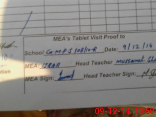 | Attendance Register | Head Teacher | MEA with School | Visit Proof |