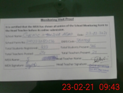 | Certified that this School was Inspected by the Undersigned MEA/DMO Today and the Information Stated Above is as Per Record. | |||||