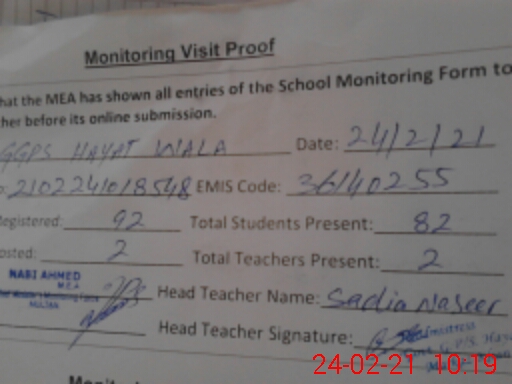| EMIS Code: 36140255 | Name of School: GGPS HAYAT WALA | |||