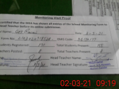 | Attendance Register | Head Teacher | MEA with School | Visit Proof |