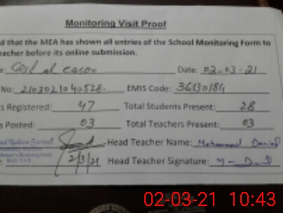 | Attendance Register | Head Teacher | MEA with School | Visit Proof |