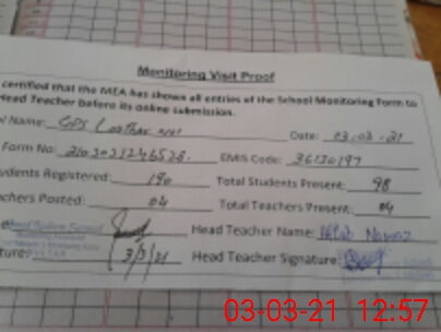 | Attendance Register | Head Teacher | MEA with School | Visit Proof |
