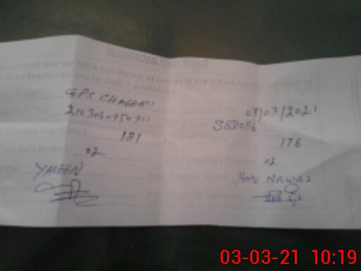 | Name: HA**** NA**** Designation: (School Headmaster's/Headmistress's) HEADMASTER Phone/Cell Number: 03**** |