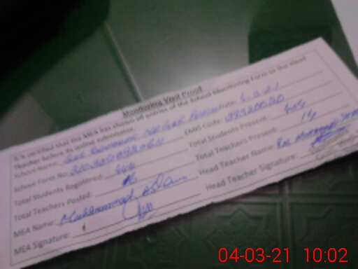 | Attendance Register | Head Teacher | MEA with School | Visit Proof |