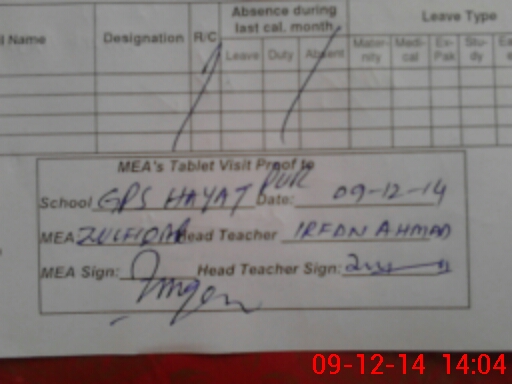 | Attendance Register | Head Teacher | MEA with School | Visit Proof |