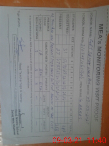 | Remarks (Use Separate Page if Required): In random attendance of 15 students listed students are promoted to next class total 10 teachers are posted and present but in mea tab teachers are 8 | |||||
