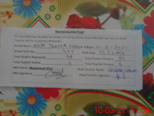 | EMIS Code: 32320452 | Name of School: GGPS THATTA GURMANI | |||