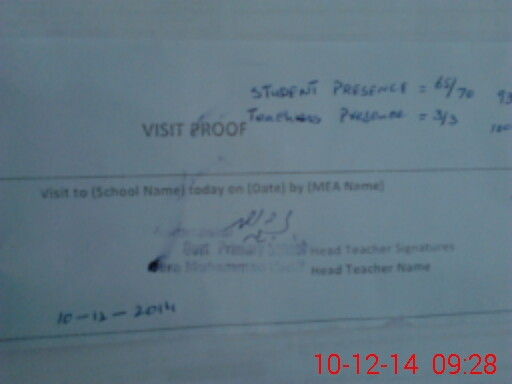 | Attendance Register | Head Teacher | MEA with School | Visit Proof |