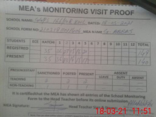 | Attendance Register | Head Teacher | MEA with School | Visit Proof |