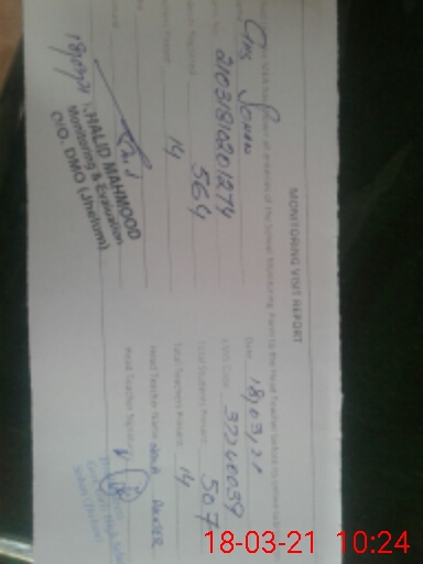 | School Visited by School Health & Nutrition Supervisor (No. of Visits) | 1 | Name1: | SULMAN DAR | Name2: | |