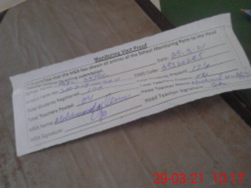 | Attendance Register | Head Teacher | MEA with School | Visit Proof |