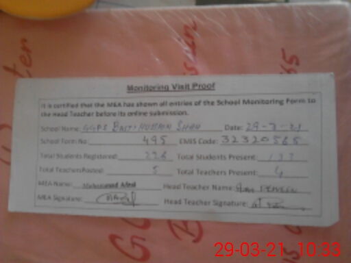 | Attendance Register | Head Teacher | MEA with School | Visit Proof |