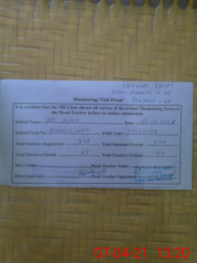| Attendance Register | Head Teacher | MEA with School | Visit Proof |