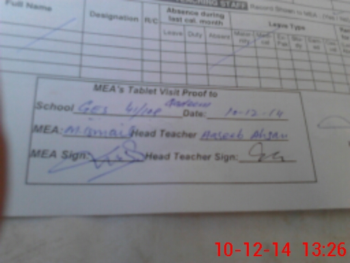 | Attendance Register | Head Teacher | MEA with School | Visit Proof |