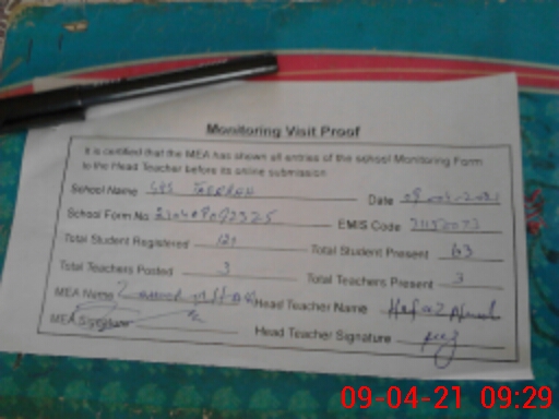 | Attendance Register | Head Teacher | MEA with School | Visit Proof |