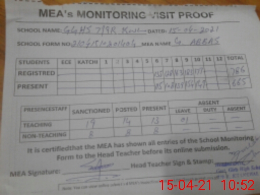 | Certified that this School was Inspected by the Undersigned MEA/DMO Today and the Information Stated Above is as Per Record. | |||||