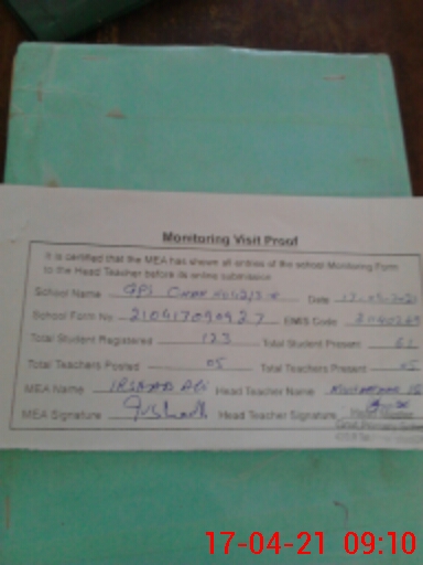 | Attendance Register | Head Teacher | MEA with School | Visit Proof |