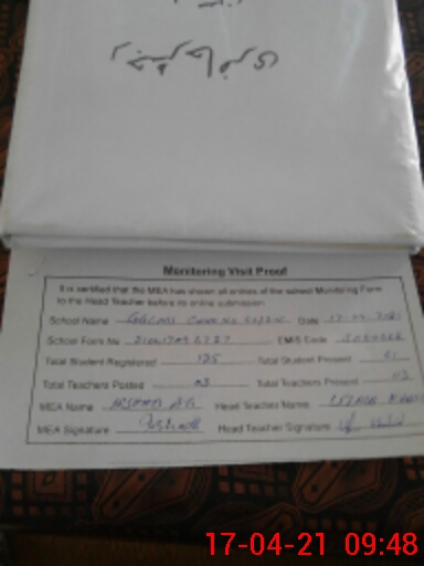 | Attendance Register | Head Teacher | MEA with School | Visit Proof |