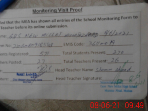 | EMIS Code: 36110019 | Name of School: GHS NEW MILLAT MUMTAZABAD MULTAN | |||