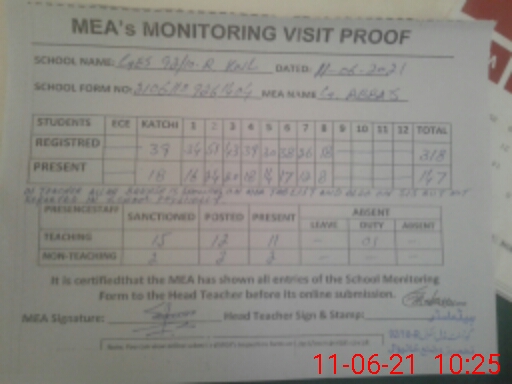 | Remarks (Use Separate Page if Required): In random attendance of 15 students listed students are promoted sis not updated 01 teacher Allah bakhsh is showing on mea tab and on sis but physical he did not report in school | |||||