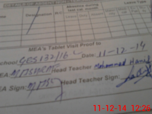 | Attendance Register | Head Teacher | MEA with School | Visit Proof |