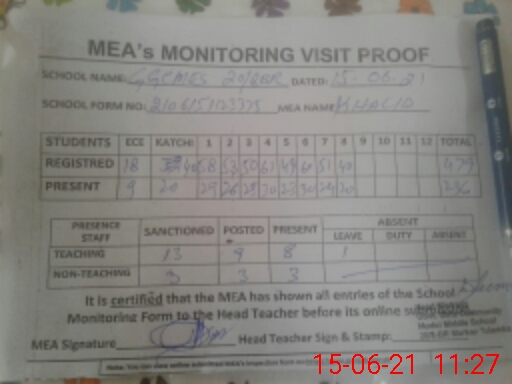 | Attendance Register | Head Teacher | MEA with School | Visit Proof |