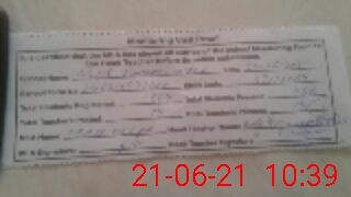 | School Visited by School Health & Nutrition Supervisor (No. of Visits) | Name1: | ZAKIR HUSSAIN | Name2: | Nil | |