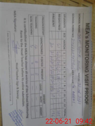| Attendance Register | Head Teacher | MEA with School | Visit Proof |