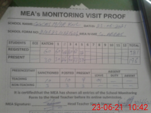 | Attendance Register | Head Teacher | MEA with School | Visit Proof |