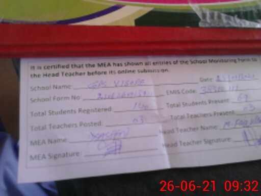 | Attendance Register | Head Teacher | MEA with School | Visit Proof |
