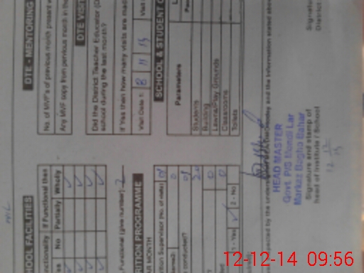 | School Visited by School Health & Nutrition Supervisor (No. of Visits) | 1 | Name1: | Humera Saeed | Name2: | None |