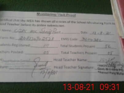 | Certified that this School was Inspected by the Undersigned MEA/DMO Today and the Information Stated Above is as Per Record. | |||||