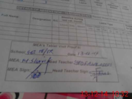 | Attendance Register | Head Teacher | MEA with School | Visit Proof |