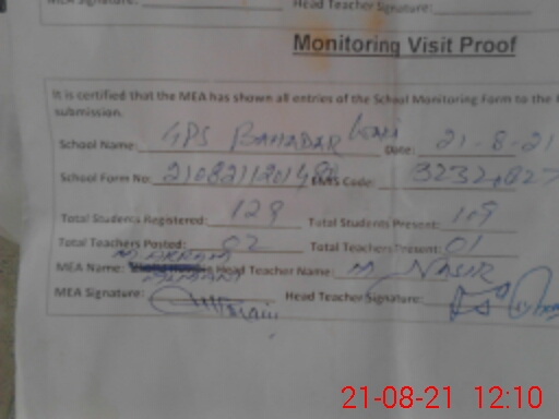 | EMIS Code: 32320827 | Name of School: GPS BAHADAR WALI | |||